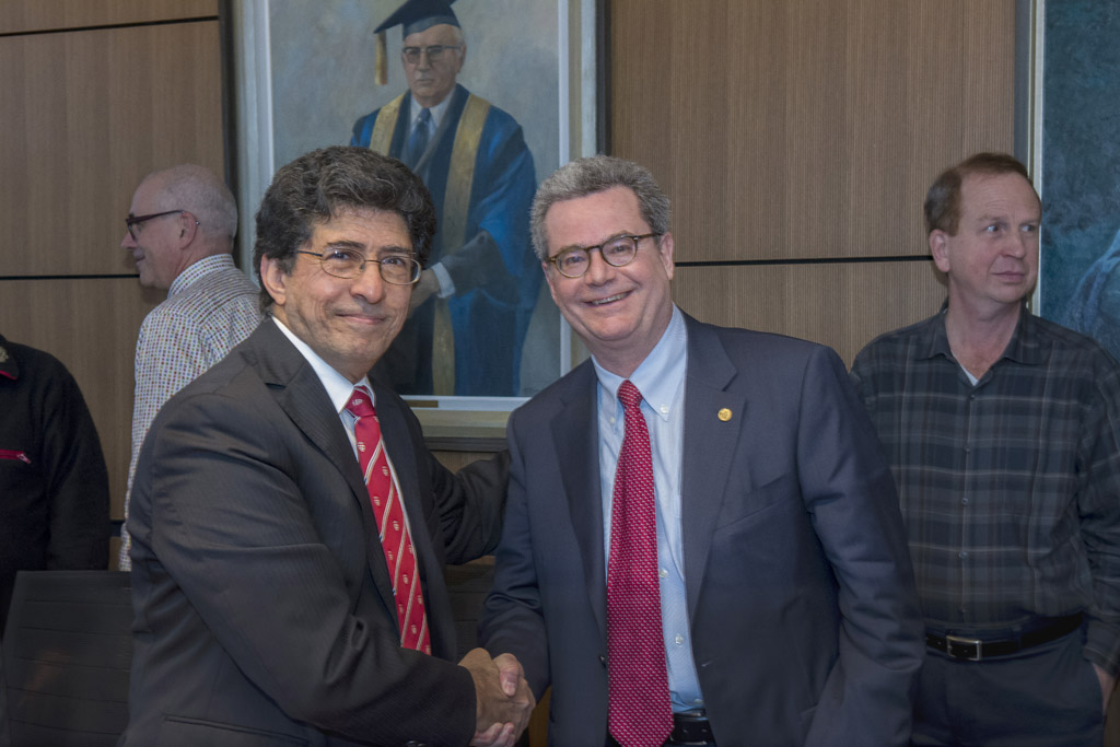 MCLIU president Raad Jassim and McGill Provost Christopher Manfredi at the signing of the first collective agreement in October 2015.